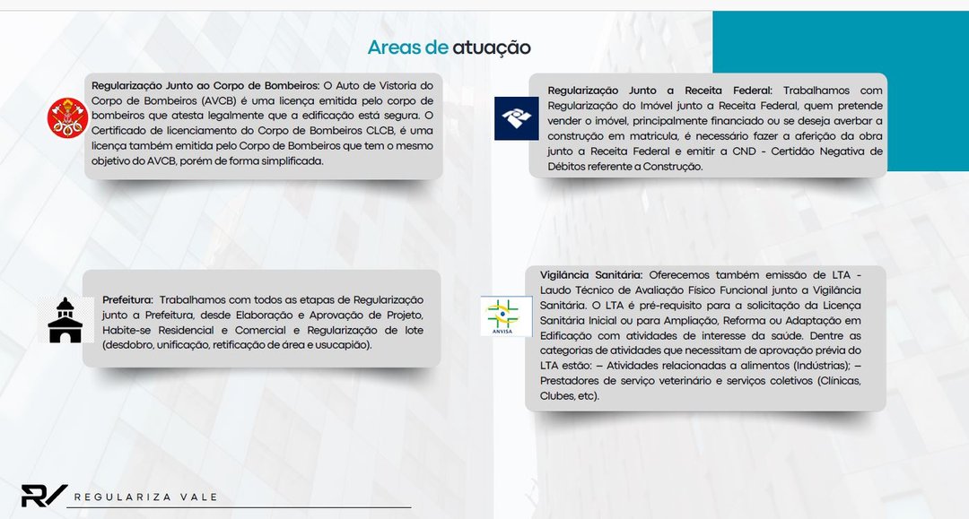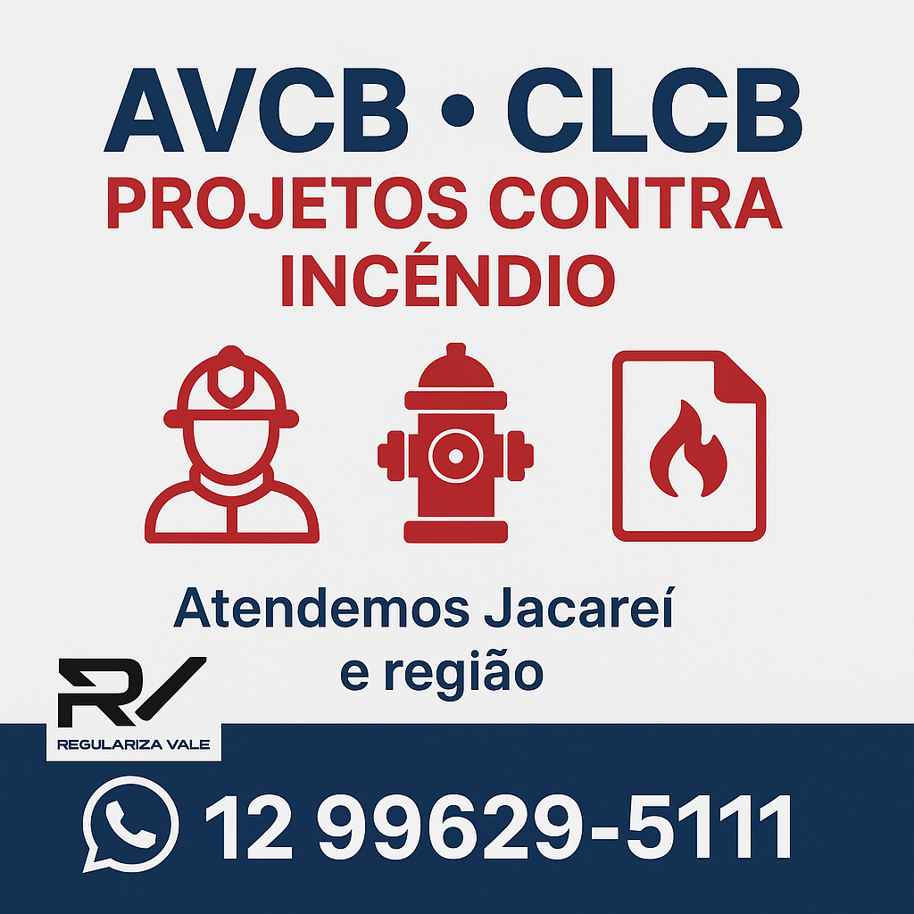 A Regulariza Vale é especialista em regularização residencial e comercial em São José dos Campos, Jacareí e todo o Vale do Paraíba. Atuamos com emissão de AVCB e CLCB do Corpo de Bombeiros, licenças para imóveis comerciais SP, Habite-se, Laudo Técnico da Vigilância Sanitária (LTA), averbação de construção e regularização de INSS de obras com até 100% de redução no imposto para emissão da CND. Oferecemos soluções completas, ágeis e seguras para deixar seu imóvel 100% legalizado em todos os órgãos competentes. Atendemos clientes residenciais, comerciais e industriais com atenção personalizada, tranquilidade jurídica e foco na regularização de imóveis no Vale do Paraíba. Precisa emitir AVCB em Jacarei? Fale com a gente!